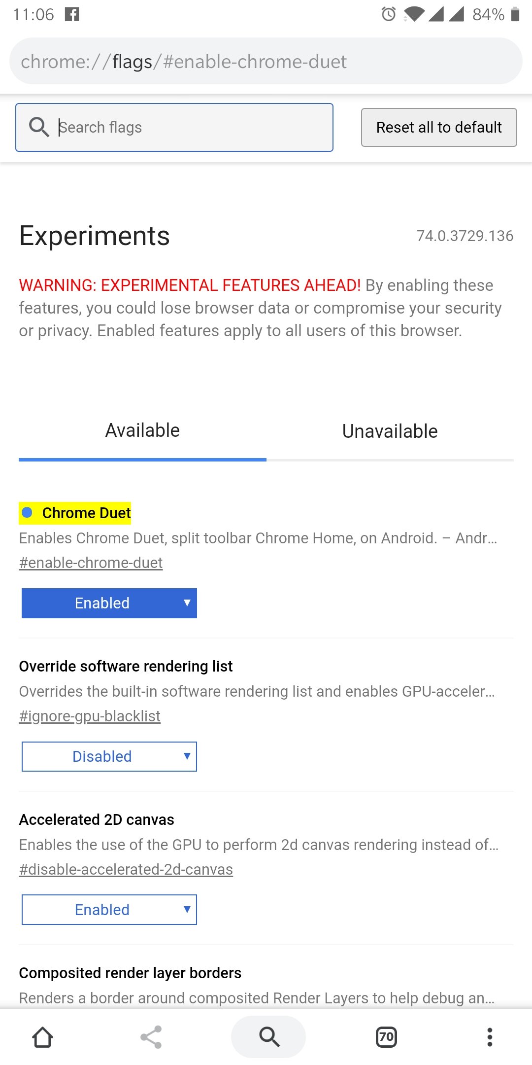 Now using the search flags textbox ose Find in page option, type for Chrome Duet.
